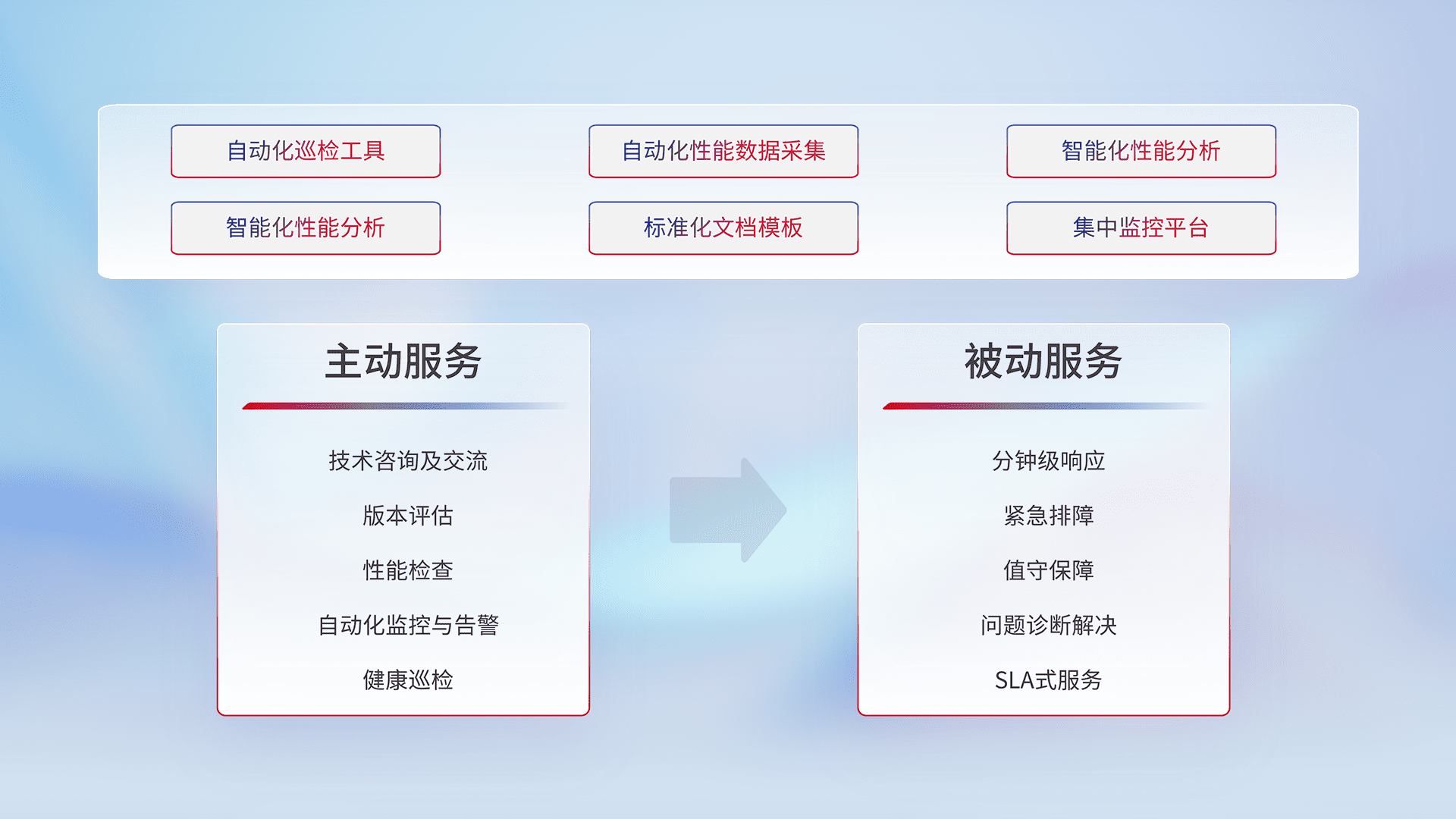 智能化工具和标准化文档,,,,保障服务质量,,提供主动服务(包含技术咨询、、版本评估、、性能检查、、、、自动化监控与告警、、、健康巡检)和被动服务包含(分钟级响应、、紧急排障、、、值守保障、、、、问题诊断解决、、、、SLA服务)。。